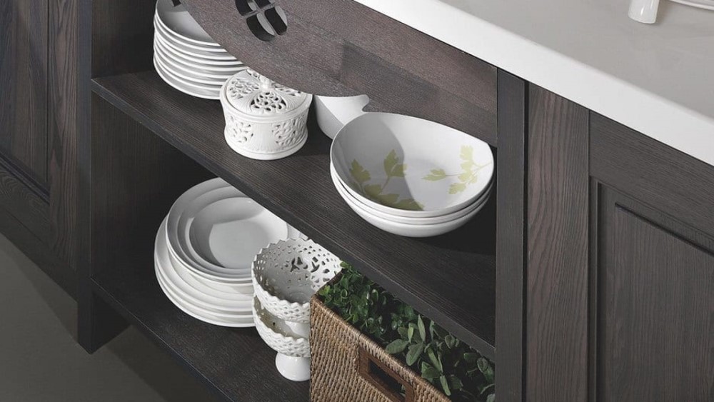 La cucina componibile Aisha riprende i tratti delle vetrine in stile inglese creando spazi funzionali dal gusto unico ed originale. Vani a giorno, vetrine e gli elementi ciechi si alternano, entrambi impreziositi dalle maniglie barocco argentate.
