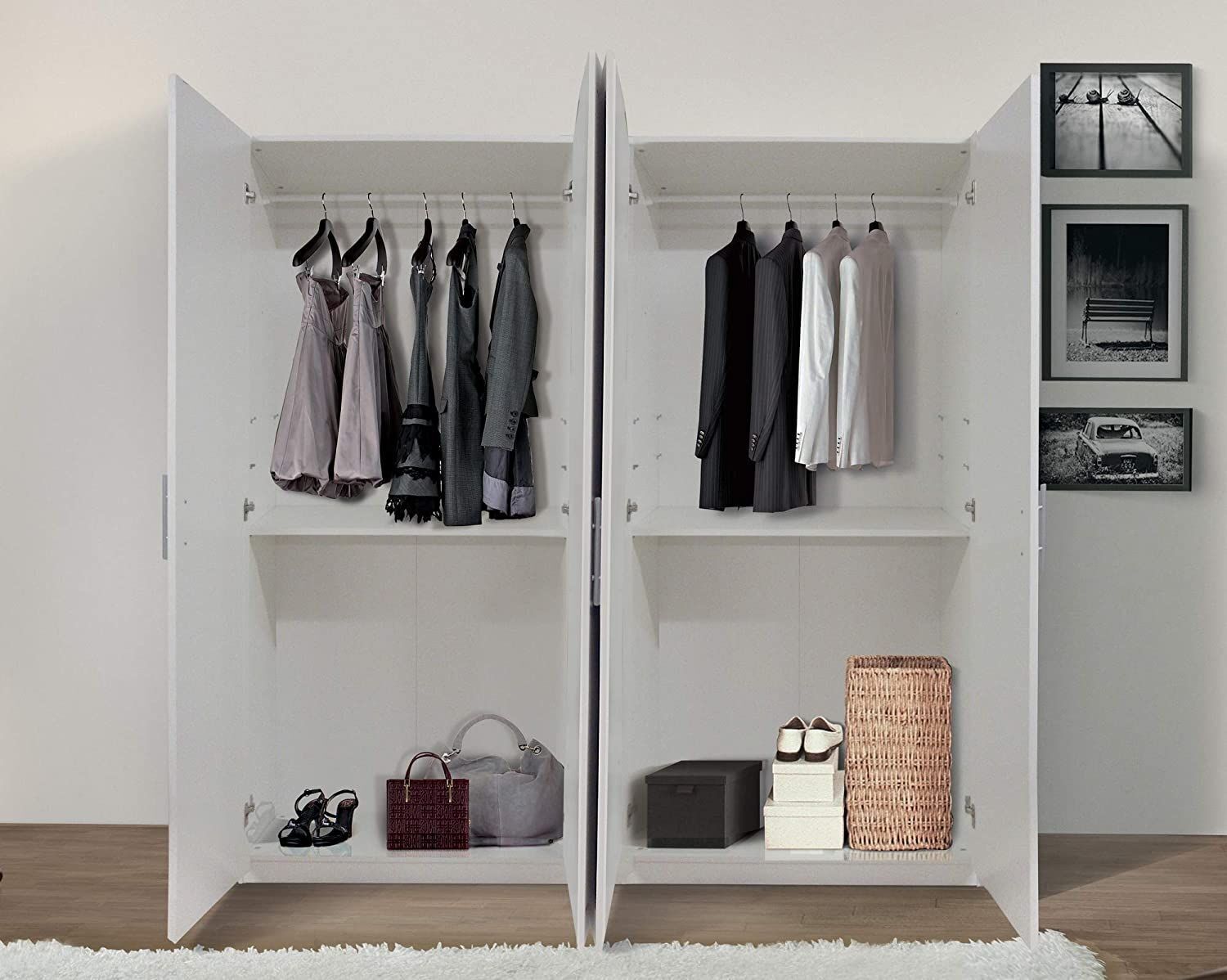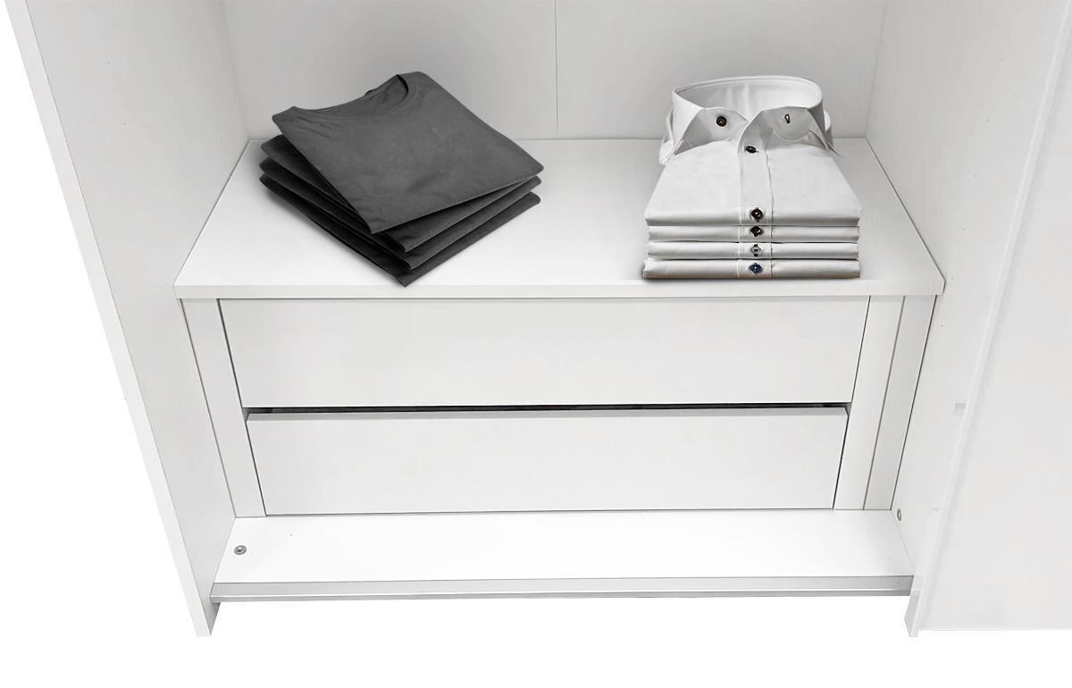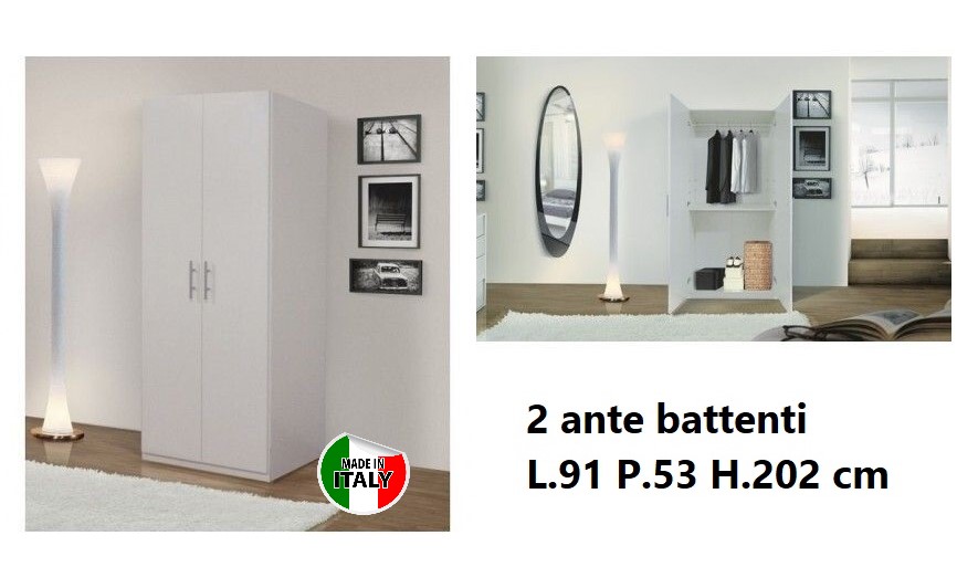 Dotazione interna di serie: 2 tubi appendiabiti e 1 ripiano ogni vano 2 ante